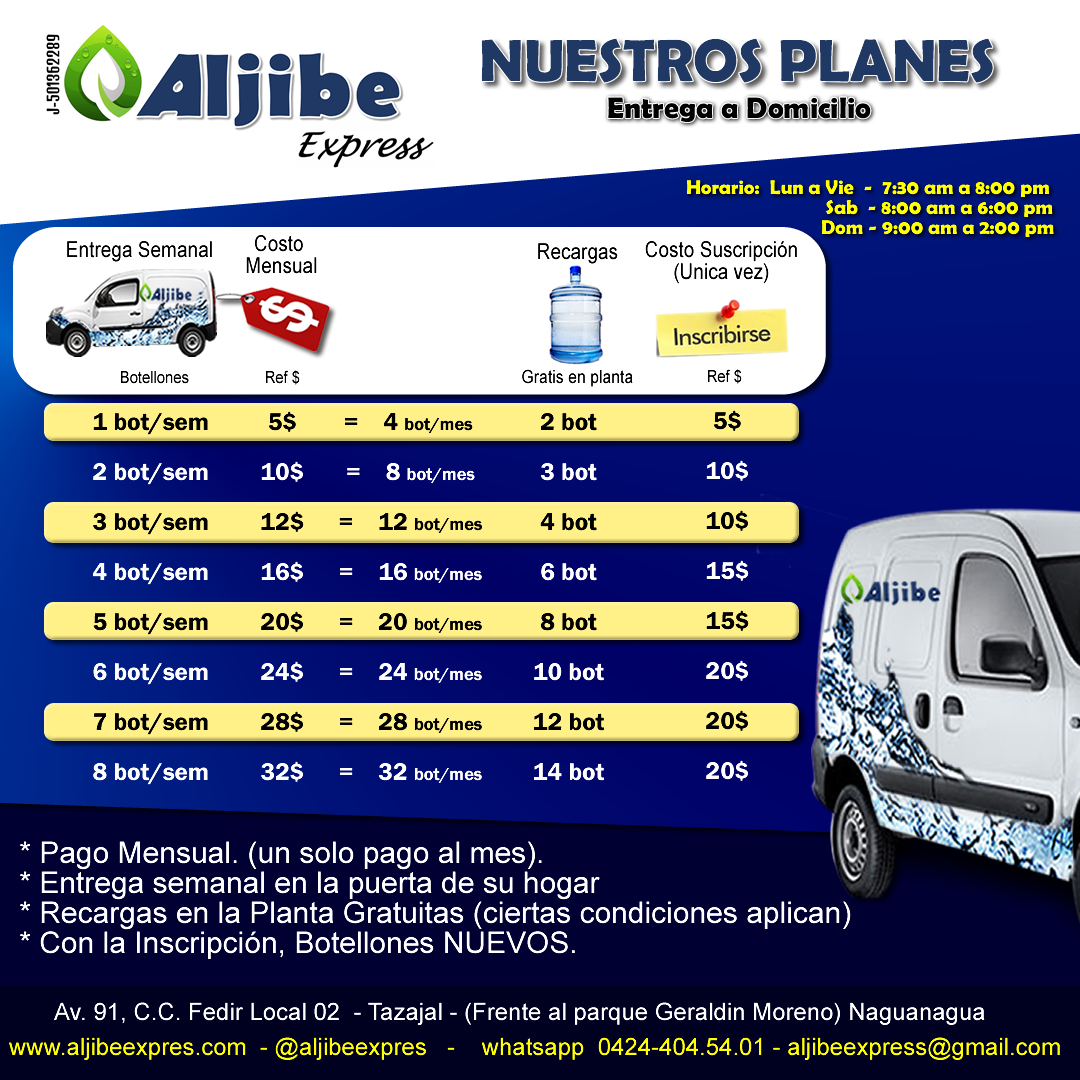 Nuestros Planes de Entrega a Domicilio estan diseñados de acuerdo a su necesidad de consumo, en entregas semanales en la comodidad de su hogar.